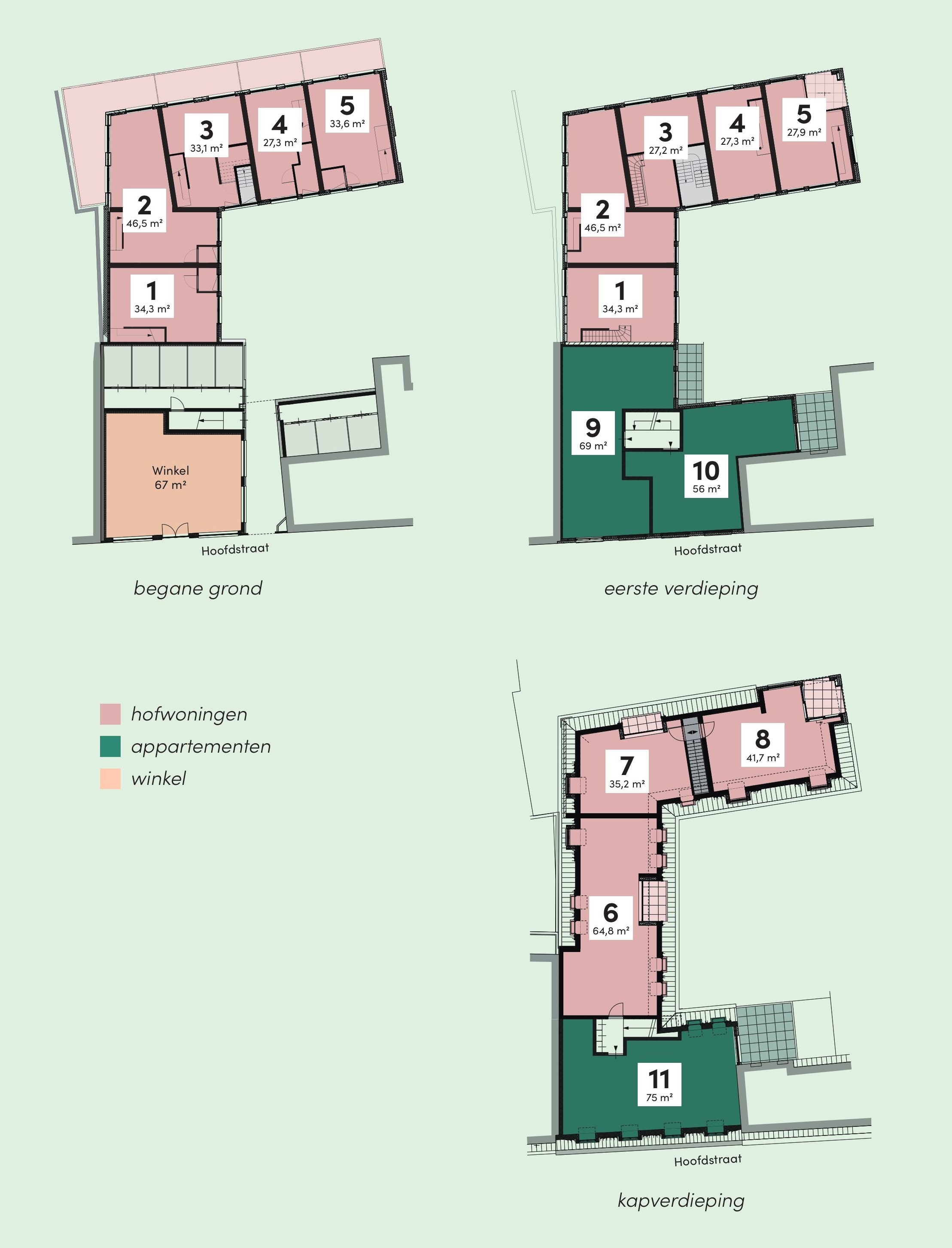 Aan de Hoofdstraat worden drie stijlvolle appartementen gerealiseerd die naadloos aansluiten bij het bestaande straatbeeld. Met woonoppervlaktes van circa 56 m² tot 75 m² bieden deze woningen ruimte aan een brede doelgroep, van starters tot kleine huishoudens.